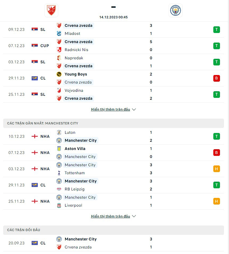 Thành tích thi đấu của đội tuyển Crvena Zvezda vs Man City
