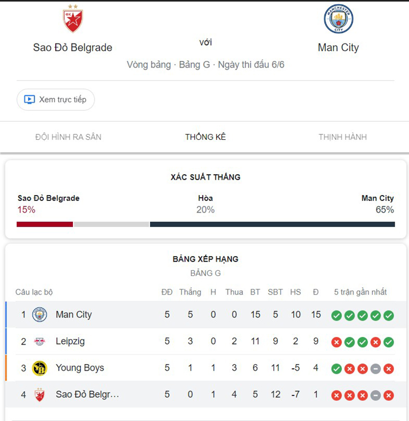 Bảng xếp hạng của Crvena Zvezda và Man City