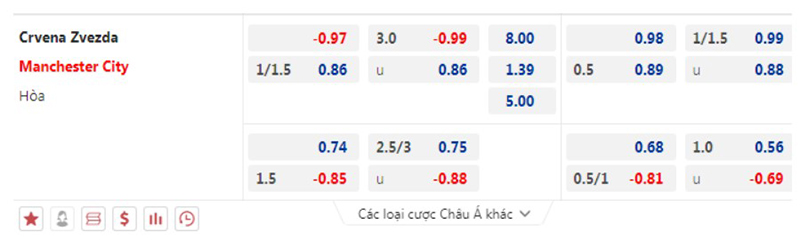 Bảng tỷ lệ kèo trận đấu giữa Crvena Zvezda vs Man City