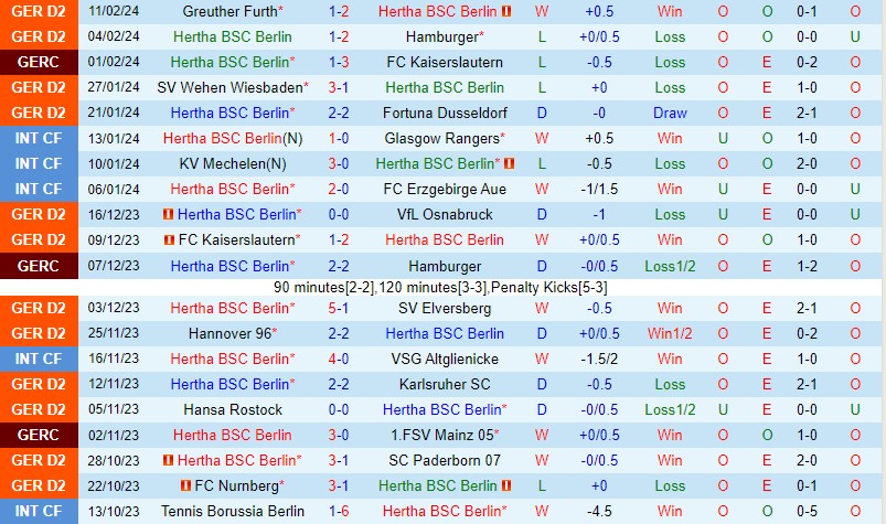 Hertha Berlin bất bại cả 9 trận cuối cùng của năm 2023. ngoài ra, 5 trận đã đấu trong năm mới 2024, đại diện thủ đô chỉ thắng được 1. Chính là khúc khải hoàn 2-1 trên sân Greuther Furth vào cuối tuần trước. tư thế có phần sa sút ấy khiến đoàn quân của HLV Pál Dárdai đang rơi vào thế trở ngại trong cuộc đua thăng hạng.
