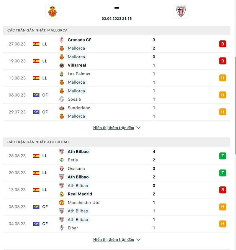 Kết quả đối đầu giữa đội tuyển Mallorca vs Ath Bilbao