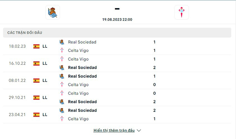5 trận đối đầu gần đây nhất giữa đội tuyển Real Sociedad vs Celta Vigo đội chủ nhà tỏ ra vượt trội hơn hẳn với 4 trận thắng và 1 trận hòa trước Celta Vigo.