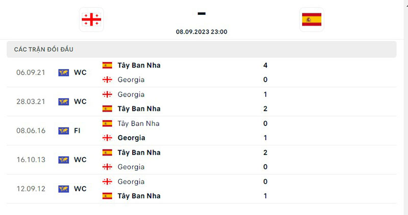 Georgia vs Tây Ban Nha rõ ràng là có sự vượt xa về đẳng cấp. Điều này được thể hiện rất rõ ở các cuộc đối đầu giữa hai đội bóng. Cụ thể 5 trận gặp nhau gần đây nhất, đội tuyển Tây Ban Nha thắng 4 trận và chỉ để thua 1 trận của giải đấu giao hữu quốc tế vào năm 2016.