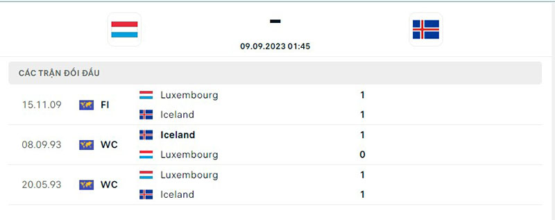 Luxembourg vs Iceland đã từng gặp nhau 3 lần trong lịch sử vào các năm 1993 và 2009. Trong đó 2 trận kết thúc với kết quả hòa 1-1 và 1 trận Iceland giành chiến thắng.