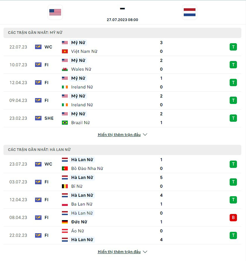 Cả 5 trận đấu gần đây nhất của hai đội tuyển nữ Mỹ vs nữ Hà Lan thì đội tuyển nữ Mỹ đều giành được chiến thắng. Trong đó có tới 4 trận họ thắng với tỷ số cách biệt 2 bàn.