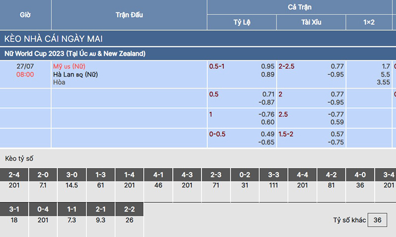 Bảng tỷ lệ kèo trận đấu giữa đội tuyển nữ Mỹ vs nữ Hà Lan