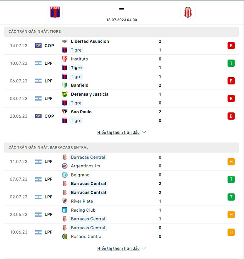 Thành tích thi đấu của đội tuyển Tigre vs Barracas Central