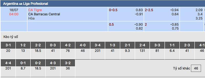 Bảng tỷ lệ kèo trận đấu giữa đội tuyển Tigre vs Barracas Central