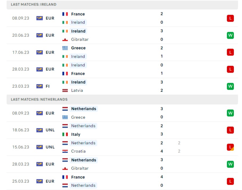 Hà Lan, trong khi đó, hiện đang có 6 điểm và đứng thứ 2 tại bảng đấu sau 2 chiến thắng và 1 thất bại, với trận thua duy nhất trước đội đầu bảng Pháp. Trận đấu với Ireland ở lượt trận thứ 4 sẽ là cơ hội lớn để Hà Lan tiếp tục củng cố vị trí thứ 2 của mình sau giai đoạn lượt đi của vòng loại.