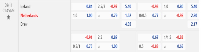 Mặc dù phải thi đấu trên sân khách, Hà Lan được đánh giá cao hơn với kèo chấp 1 hòa. Tỷ lệ này là một bước tiến lớn so với quá khứ, đồng thời tạo ra hy vọng cho đội “Lốc Da Cam.” Trong khi đó, Ireland đã thi đấu không tốt và thua theo châu Á trong 3 trận gần nhất. Hà Lan đã thể hiện dấu hiệu tích cực và thắng kèo trong trận đấu gần đây. Vì vậy, có lý do để tin vào cơ hội của Hà Lan trong trận này.
