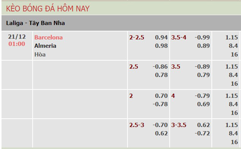Trận đấu giữa Barcelona và Almeria có kèo chấp được đặt ở mức 2 1/4 quả cả trận, với tỷ lệ ăn kèo là -0.94 cho Barcelona và 0.98 cho Almeria.