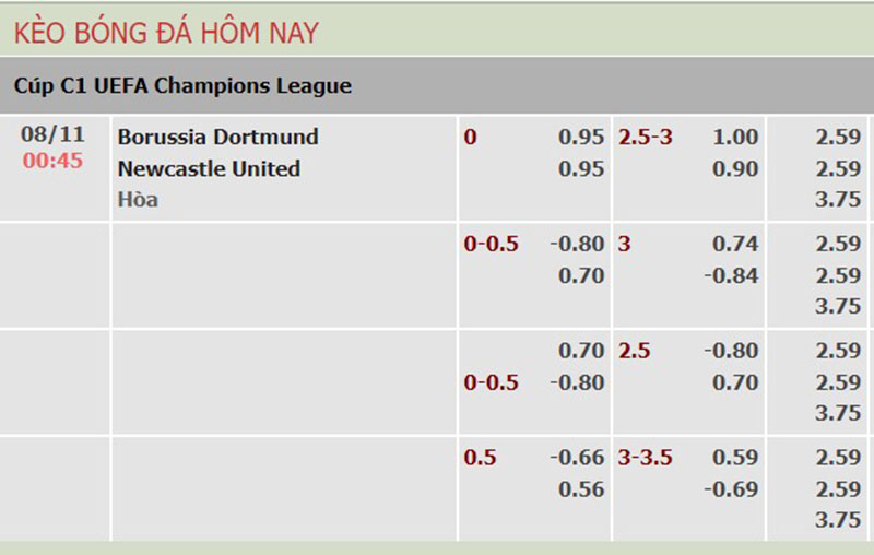 Bảng tỷ lệ kèo trận đấu giữa đội tuyển Dortmund vs Newcastle