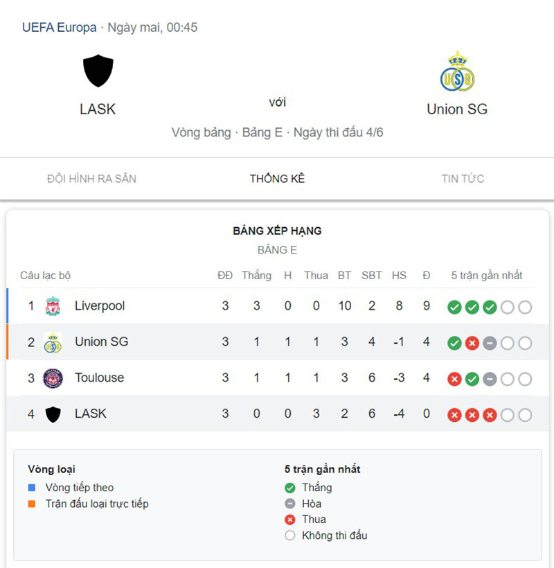 Sau 3 trận đấu, LASK đã trắng tay với 3 thất bại. Họ đang đứng ở đáy bảng E và có thể sẽ tiếp tục đóng vai trò “lót đường” ở bảng này. Trong trận lượt đi, Union SG đã vượt trội LASK và giành chiến thắng với tỷ số 2-1.