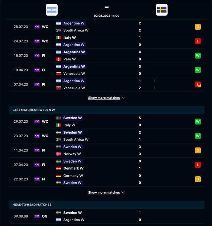 Trong lịch sử, đội tuyển nữ Argentina vs nữ Thụy Điển mới gặp nhau 1 lần là vào năm 2008. Khi đó đội tuyển nữ Thụy Điển đã giành thắng lợi trước đội tuyển nữ Argentina với tỷ số 1-0.