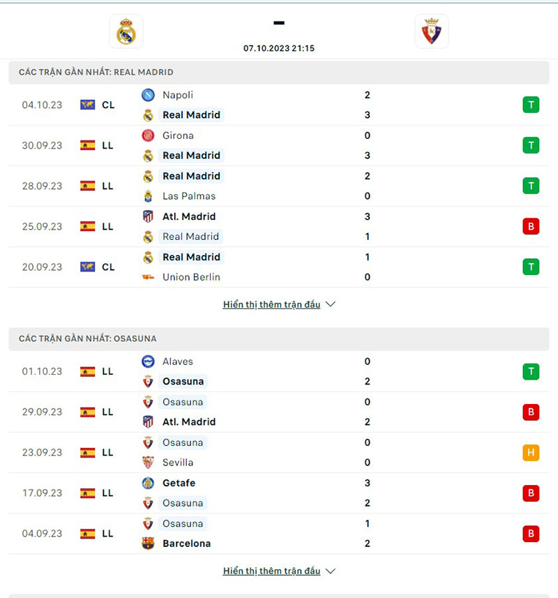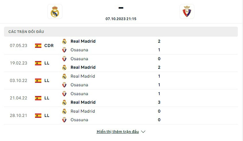 Thành tích thi đấu của đội tuyển Real Madrid vs Osasuna
