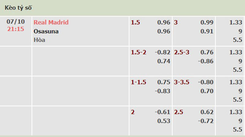 Bảng tỷ lệ kèo trận đấu giữa đội tuyển Real Madrid vs Osasuna