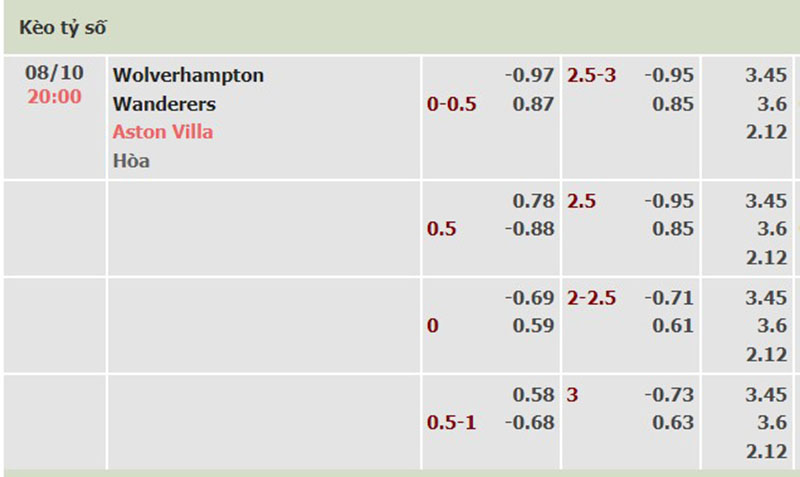 - Kèo châu Âu 3.45*2.12*3.6 fulltime => Chọn Aston Villa thắng.