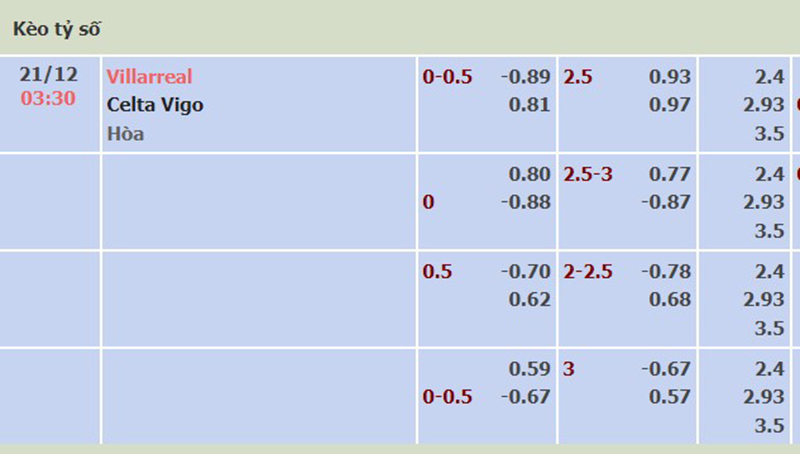 Nhà cái đưa ra tỷ lệ kèo hòa là 3.50 cho cả trận đấu. Trong đó, Villarreal có mức cược hòa là 2.40, trong khi Celta Vigo nhận được tỷ lệ cược là 2.93.